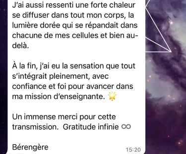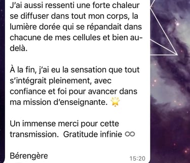 Transformation personnelle : Guider les participants à libérer leur lumière intérieure, à se connecter à leur essence divine, et à vivre en harmonie avec leur être authentique.