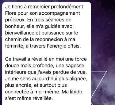 Le Triangle d’Or d’Isis est un soin de renaissance du Féminin Sacré. Portée par l’énergie d’Isis, cette fréquence de guérison ouvre un espace où les blessures de l’intime se transmutent, où le désir et la créativité se réveillent, et où la puissance intérieure reprend sa juste place. Ce soin invite chaque femme à se réapproprier son corps, sa sensibilité et sa souveraineté, afin de créer une vie fidèle à ses désirs profonds, avec assurance, fluidité et alignement.